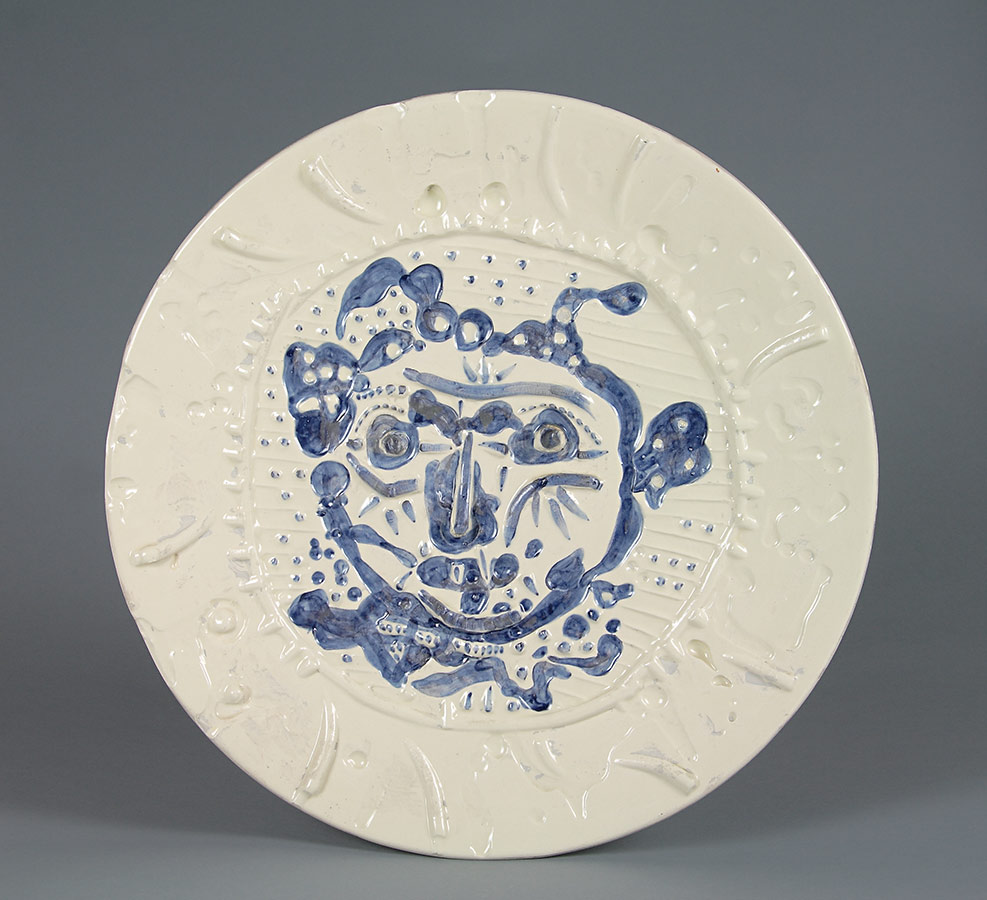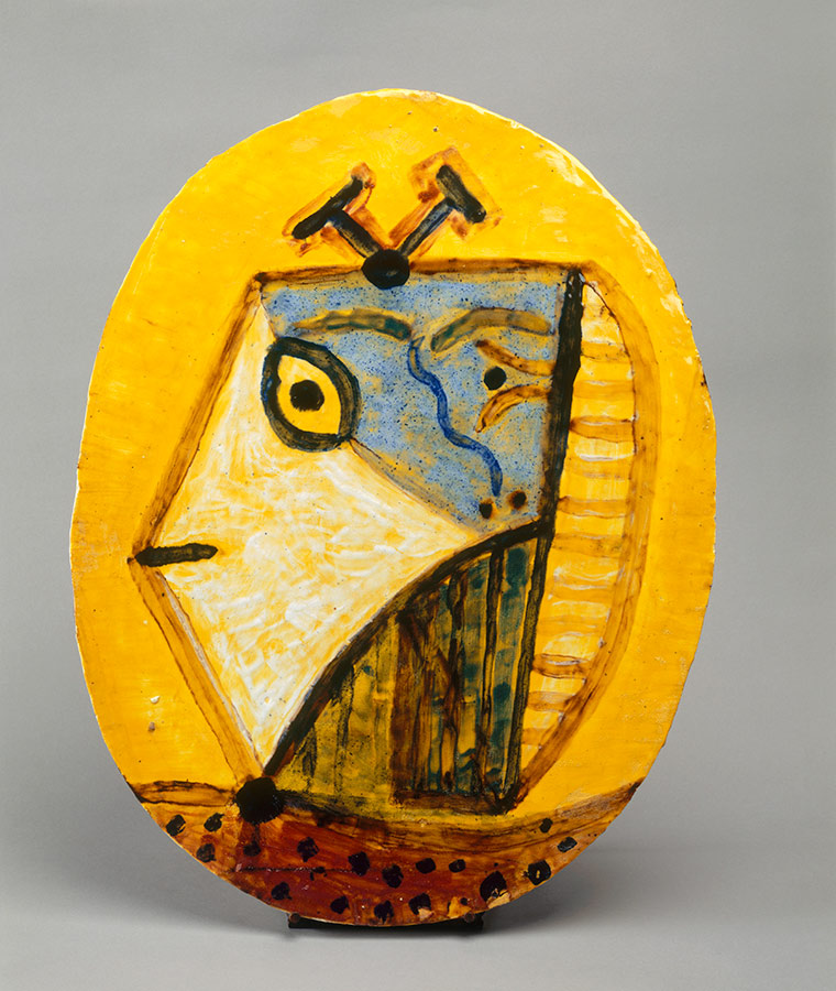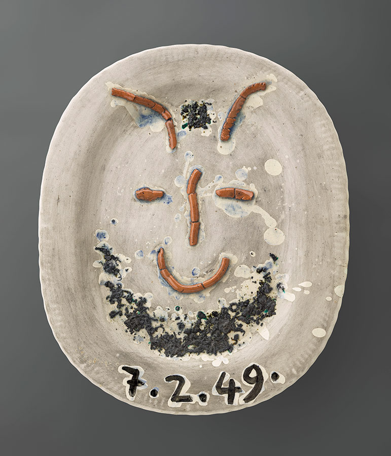 “Lastre ovale décorée d’un visage”. 1948 – 1949, Vallauris. 46 x 35,4 x 1 cm. Musée National Picasso – Paris. ©Succession Picasso / Ph: RMN- Grand Palais (Musée National Picasso – Paris) / Béatrice Hatala