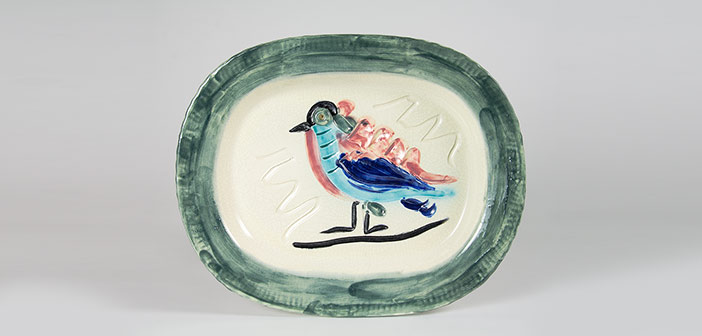 “Vassoio con colomba”. Manufactura Madoura, Vallauris (Francia),1949. 32 x 38,5 cm, (MIC Faenza, inv. n. 3084. Picasso Administration 8 rue Volney 75002 Paris tel. 01 47 03 69 65 © Succession Picasso, by SIAE 2019)