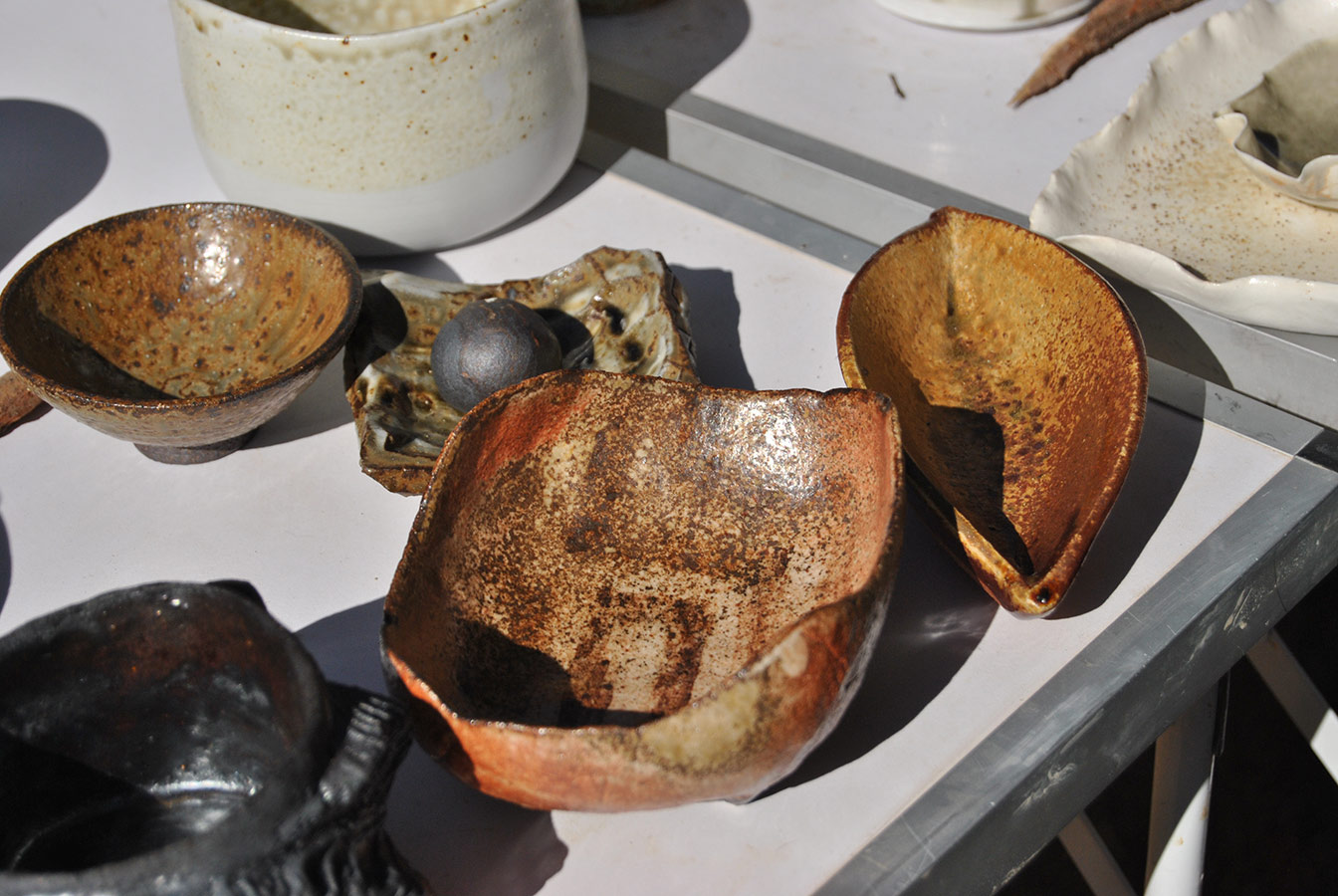 Con un día entero, el del enfriamiento del horno, dedicado a clases teóricas y otras actividades en torno a las cocciones de leña, el curso llego al momento más esperado el domingo por la mañana, con la apertura y descarga. Todo el que hace cerámica lo sabe, abrir el horno es el mejor momento de todo el proceso cerámico, pero es que en el caso de las cocciones de leña esto se multiplica, ya que el efecto de la llama siempre te sorprende, la mayoría de las veces para bien. Alguien dijo que es una forma de recuperar esa ilusión de las primeras veces, cuando, como principiante, abres la tapa del horno y de maravillas de los cambios acaecidos.