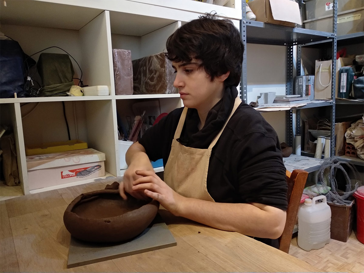 Antes de empezar a trabaja con la cerámica, Natalia era una niña muy creativa a la que se le daban bien las manualidades. La arcilla y la cerámica la atrajeron enseguida, utilizando un torno de juguete que le dejaron probar, “acariciarla y tenerla en las manos, me ha hecho viajar a diferentes universos según sus texturas y colores” , explica. Para levantar las piezas del artista utiliza un proceso de sinestesia donde a través del tacto con la arcilla se le mezclen texturas, sonidos, colores y nombres de personas.