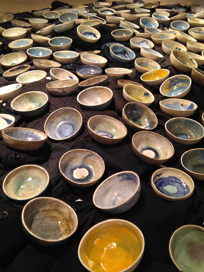Pott Zeramika propone para esta exposición la instalación Urdin? (Azul?) como proyecto participativo en la que han colaborado las personas de su entorno entregando ropa usada de color negro. NEGRO como muestra de LUTO por el mal empleo de los recursos naturales y de la propia naturaleza humana. Esta ropa negra recogida, interactúa en la instalación expuesta con una multitud de cuencos cerámicos elaborados por las dos ceramistas.