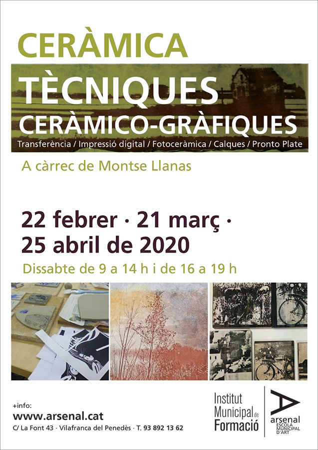 Los sabados 22 de febrero, 21 de marzo y 25 de abril, de 9 a 14 horas, Montse Llanas impartirá este curso dedicado a la transferencia de imagen en cerámica, será en la Escola Municipal d’Art Arsenal, de Vilafranca del Pendés, Barcelona