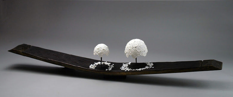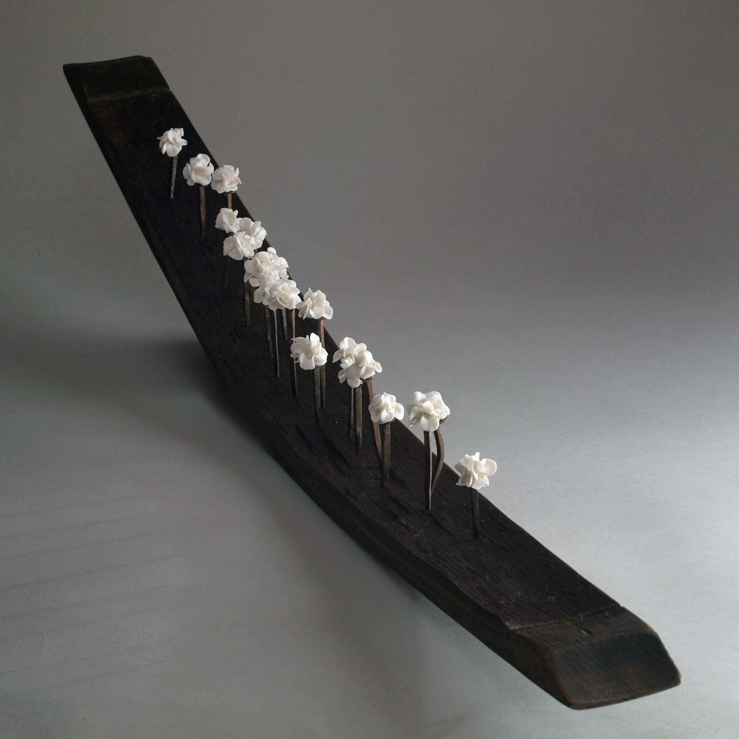No es en vano que utilice duelas* de barrica como base para las esculturas, que experimente y aplique cenizas de cepas y sarmientos con arcillas locales en los vidriados de las piezas. No es en vano que durante años haya atesorado herrajes de las casas donde he vivido y trabajado, y que integre incluso elementos ajenos al entorno en donde ahora estoy, pero que formaron parte de los lugares que fueron hogar o han dejado huella en mi vida. Todo ello aparece reflejado en las esculturas creando paisajes íntimos y evocadores.