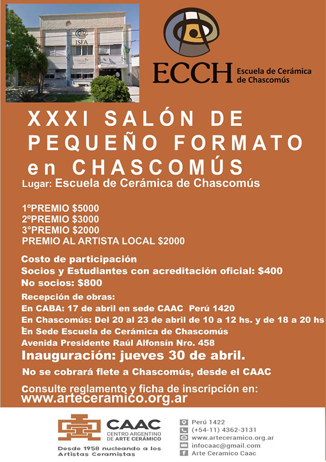 El Centro Argentino de Arte Cerámico invita a participar de su XXXI Salón de Pequeño Formato, que se inaugurará el 30 de abril en la Escuela de Cerámica de Chascomús