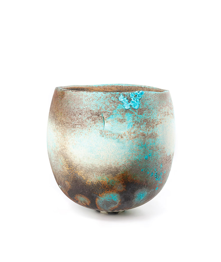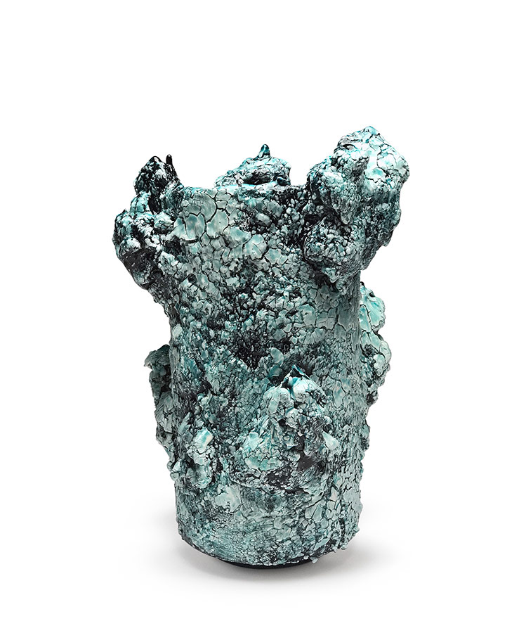 Esta obra etérea a la vez que potente se inspira en la vasija ritualista arquetípica. Se añade bicarbonato a la porcelana durante el horneado para producir una paleta de tonos oceánicos y eléctricos. La escala de la obra, combinada con su textura superficial plena de matices, provoca una imponente manipulación de luz y sombra.