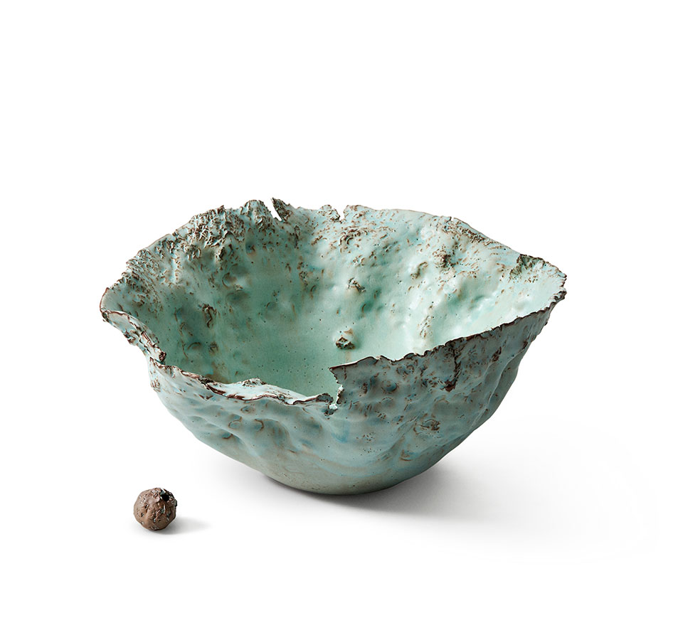 Este bol de gres y su accesorio esférico se inspiran en el sistema reproductivo de las plantas florales. Con su forma de pétalo, se da forma al bol en el torno; luego, se dan delicados pellizcos y se va uniendo el borde superior para crear una textura reminiscente del coral o de la vegetación en descomposición. El método táctil de Kim es ciertamente visible, mientras que el color aguamarina le aporta un toque majestuoso añadido a su diseño terrenal.