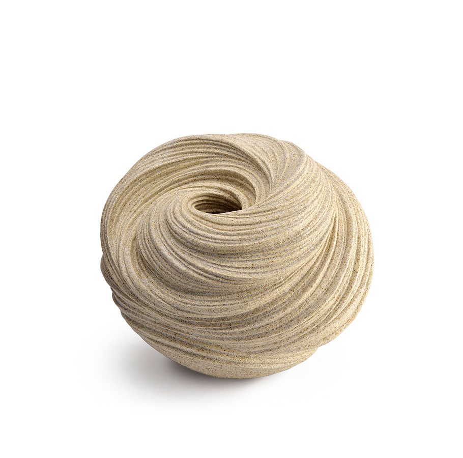 Sakiyama siempre ha vivido cerca del mar, una inagotable fuente de inspiración en toda su obra. El diseño de las superficies talladas y onduladas de este recipiente de gres refleja de manera excelsa el ciclo de las mareas —pleamar y bajamar— de los océanos y sus corrientes. Su estructura de doble pared le aporta rigidez al objeto, aunque su forma acuosa lo dota de un aspecto enérgico, casi ingrávido, como si estuviera en movimiento continuo.