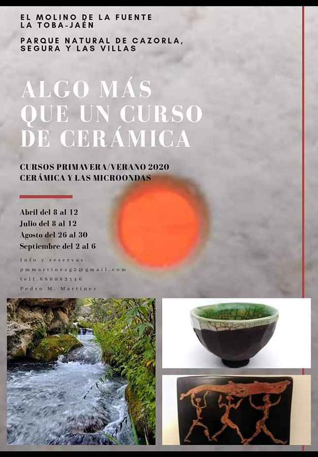Nos adentraremos en el mundo de las microondas como generadoras de calor ultra rápido que aprovecharemos para hacer pruebas de cocciones de vidriados, sales y sigilatas sobre gres y porcelana, practicando los tratamientos postcocción con humo. Todo esto dado en un lugar especialmente energético, un antiguo molino rodeado de aguas cristalinas, nogales centenarios y una exuberante naturaleza que no te dejará indiferente, dentro del Parque Natural de Cazorla, Segura y las Villas. En estas convivencia disfrutamos también de excursiones a pie por la zona así como de la gastronomía del lugar y música en directo si se da la ocasión.