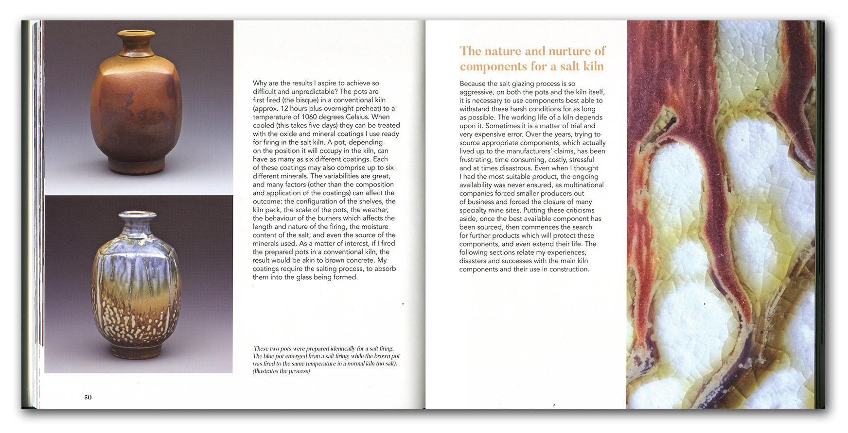 En este libro, además de la historia personal del autor, encontramos también ensauyos sobre las técnicas, Sin ser un libro técnico, se hace evidente la fascinación del autor por los procesos, como el de los esmaltes salinos, que ha utilizado durante años, y de los que es un consumado maestro. Nos habla de las técnicas, los materiales, las cocciones, los quemadores que utilliza, Lo mismo podemos leer sobre las cocciones de leña, sobre sus experimentos con el uso de la fibra cerámica para la realización de piezas de terra sigillata (la utiliza para “envolver” las piezas durante la cocción).