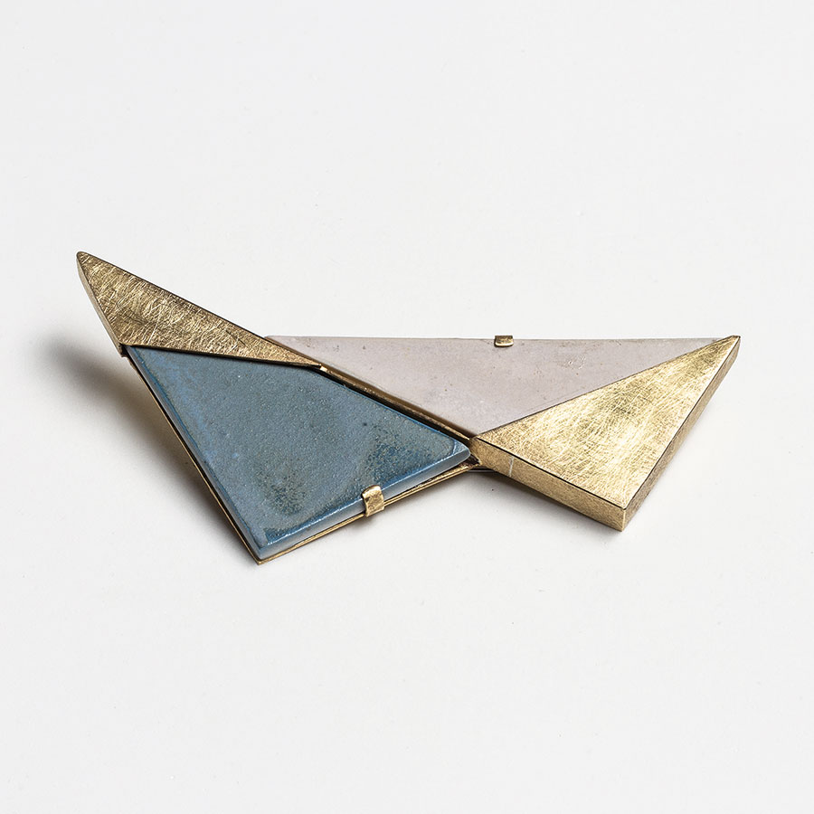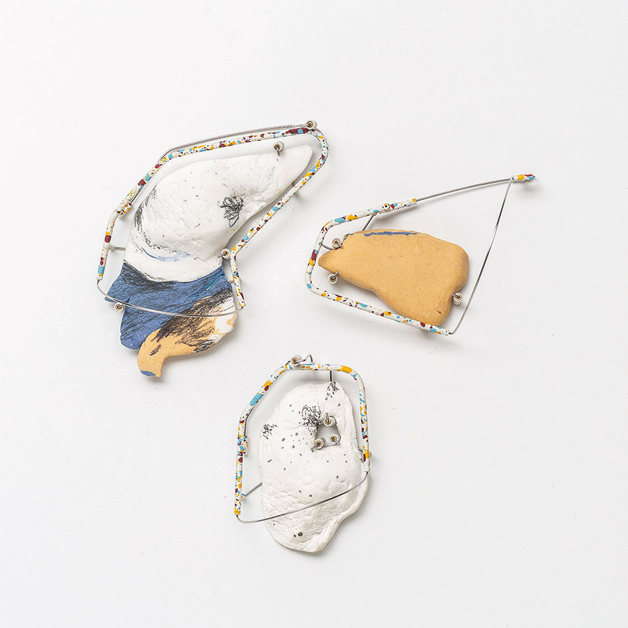 Alba María Martínez – Mario Campos. Bi-joc. Broches. 100 x 60 x 40 mm; 45 x 70 x 40 mm; 60 x 55 x 40 mm. Porcelana, latón, acero, plástico y esmalte sintético