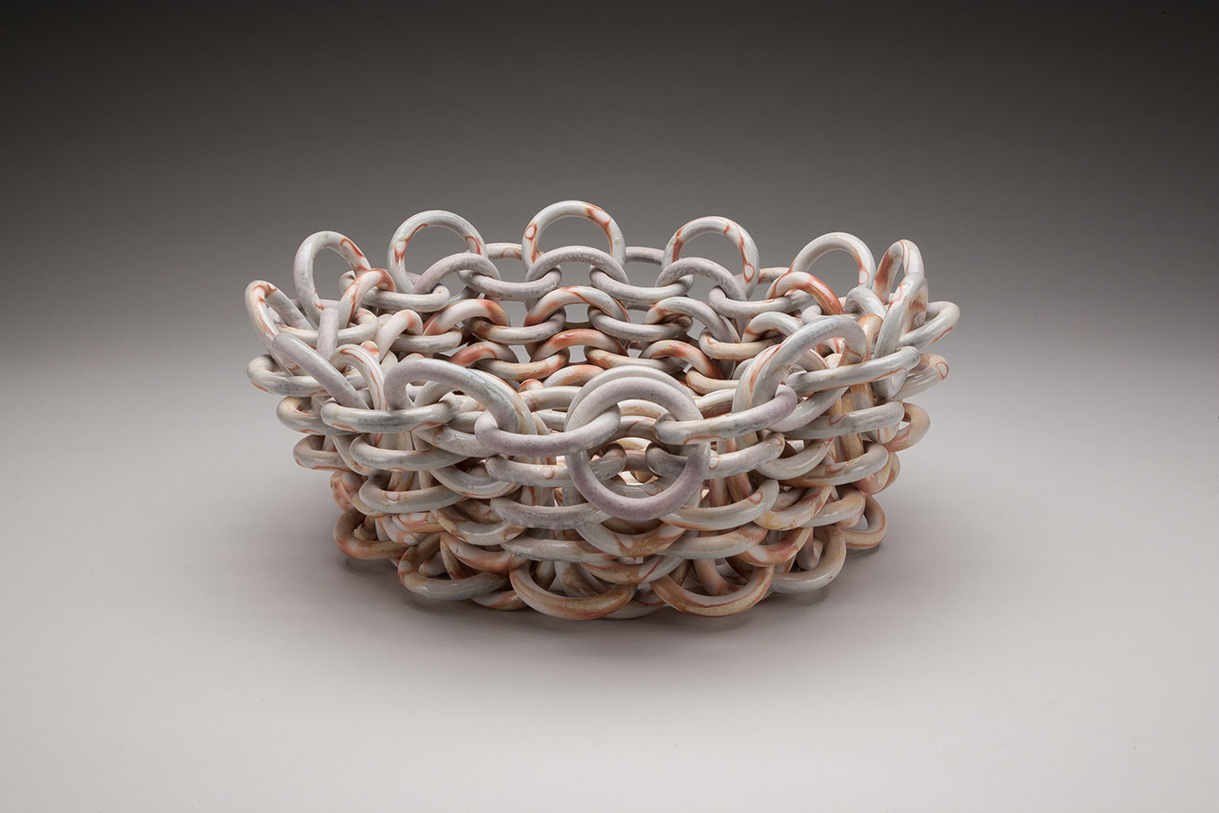 “La cota de malla está hecha de pequeños anillos metálicos entrelazados, diseñados para proteger el cuerpo en movimiento. Utilizo el patrón de cota de malla y otros patrones de tejidos para crear obras de cerámica que evocan una sensación de permanencia y ocultación defensiva. Al igual que la armadura antigua, mis piezas están hechas de una tela de anillos móviles entrelazados. Usar arcilla para hacer una malla protectora es contradictorio; porque ¿cómo puede defender algo, mucho menos a sí misma? Visualmente como piedra, las piezas parecen fuertes e impenetrables, desmintiendo su fragilidad inherente.”
