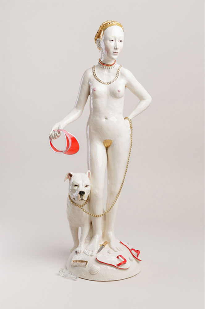“Aphrodite”, 2019. Alto, 68 cm. Baja temperatura, esmaltes, colores sobrecubierta, lustre y técnicas mixtas. Figura basada en las pinturas alegóricas de Lucas Cranach El Viejo.