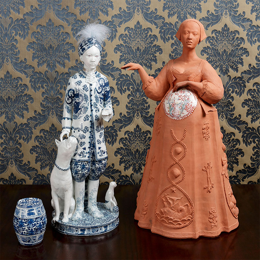 “Taking Tea – Boy”, 2018. Porcelana, esmalte, colores sobre cubierta, lustre. Detalle de la instalación en el Museo de Arte de Seattle, en la que se explora el coste humano del comercio de porcelana y la locura por la porcelana durante el siglo XVIII. Esta exposición puede verse desde diciembre de 2018 hasta diciembre de 2020.