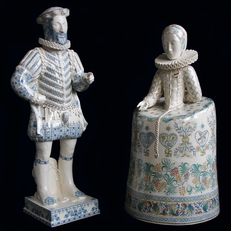 “24 Hour Party People”, 2012. Louis, alto 80 cm; Maria Therese, 65 cm.Baja temperatura, esmalte, colores sobrecubierta, lustre y técnica mixta. Pareja que representa a Luis XIV y su futura esposa Maria Therese disfrutando de un festivo estilo de vida. Las figuras se basan en imágenes icónicas: Louis como Sun King y Maria Therese como la infanta española. Luis es representado como un raver, decorado con fractales y con un silbato. Maria Therese es representada como una bebedora y fumadora.