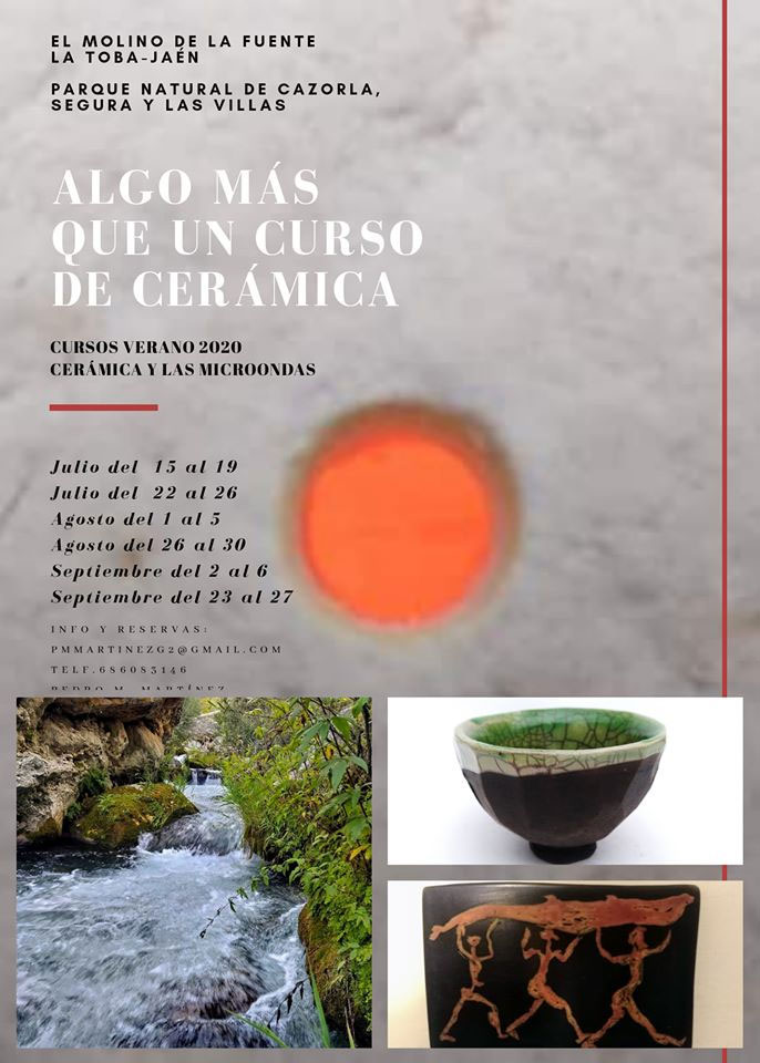 Nos adentraremos en el mundo de las microondas como generadoras de calor ultra rápido que aprovecharemos para hacer pruebas de cocciones de vidriados, sales y sigilatas sobre gres y porcelana, practicando los tratamientos postcocción con humo. Todo esto dado en un lugar especialmente energético, un antiguo molino rodeado de aguas cristalinas, nogales centenarios y una exuberante naturaleza que no te dejará indiferente, dentro del Parque Natural de Cazorla, Segura y las Villas. En estas convivencia disfrutamos también de excursiones a pie por la zona así como de la gastronomía del lugar y música en directo si se da la ocasión.