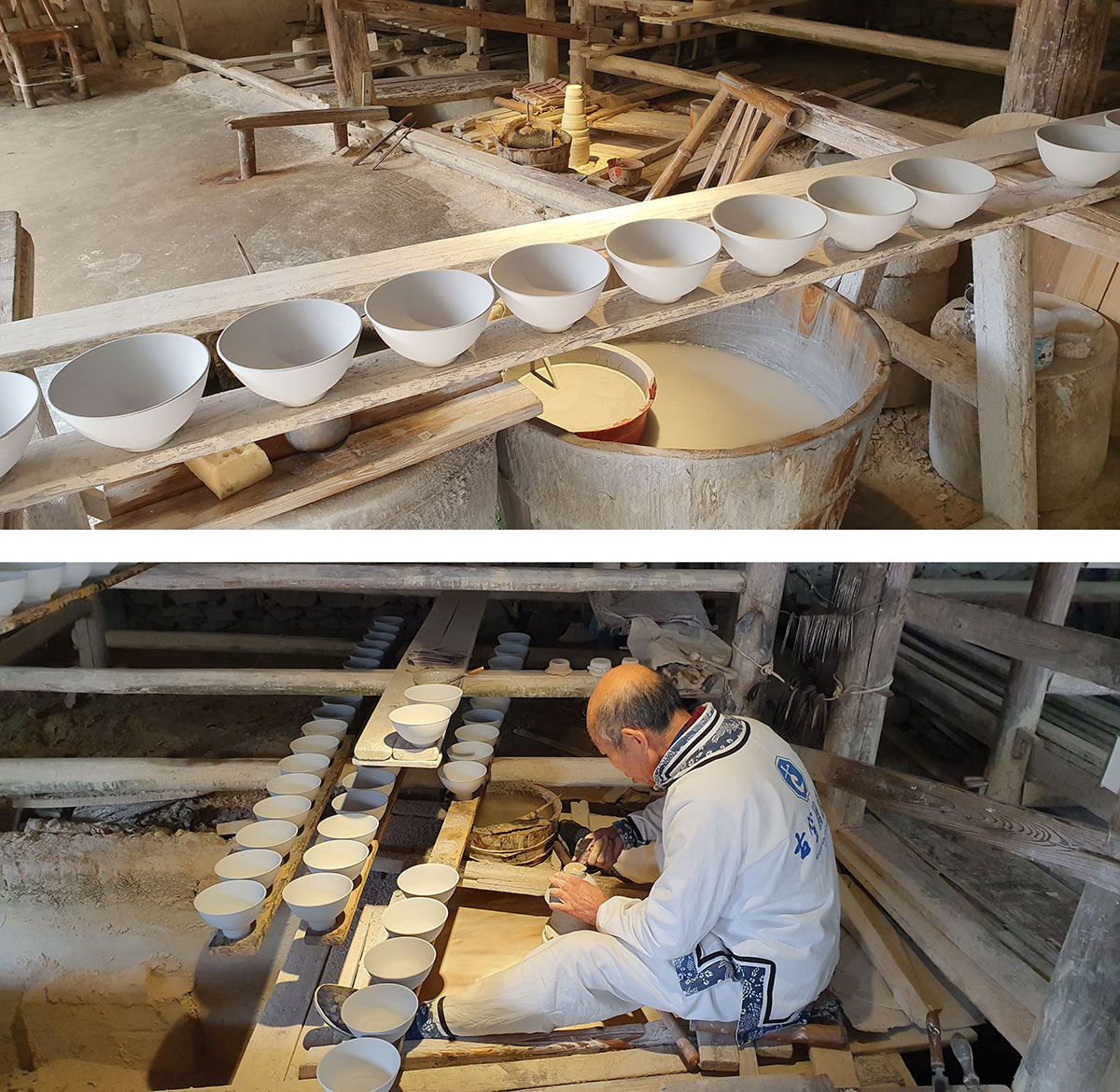 Uno de estas artistas es Su Xianzhong (1968) cuyo taller reúne esculturas abstractas compuestas de hojas de porcelana infinitamente finas, como el papel, que contrastan con sus obras eróticas. Arriba, en el segundo piso del espacio de exposición, se encuentran obras de su padre (el “maestro”); en el primer piso, sus propias creaciones y en la planta baja, las de sus alumnos, o más bien “discípulos”. A lo largo del viaje, volvimos a encontrar esta jerarquía que nos sorprendió tanto como el inmenso respeto hacia los maestros ceramistas y la increíble humildad de los discípulos que se forman copiando la obra de su mentor durante años, antes de liberarse para crear su estilo propio. Aunque no siempre es el caso, es común que la técnica se trasmita entre generaciones, de padres a hijos e hijas.