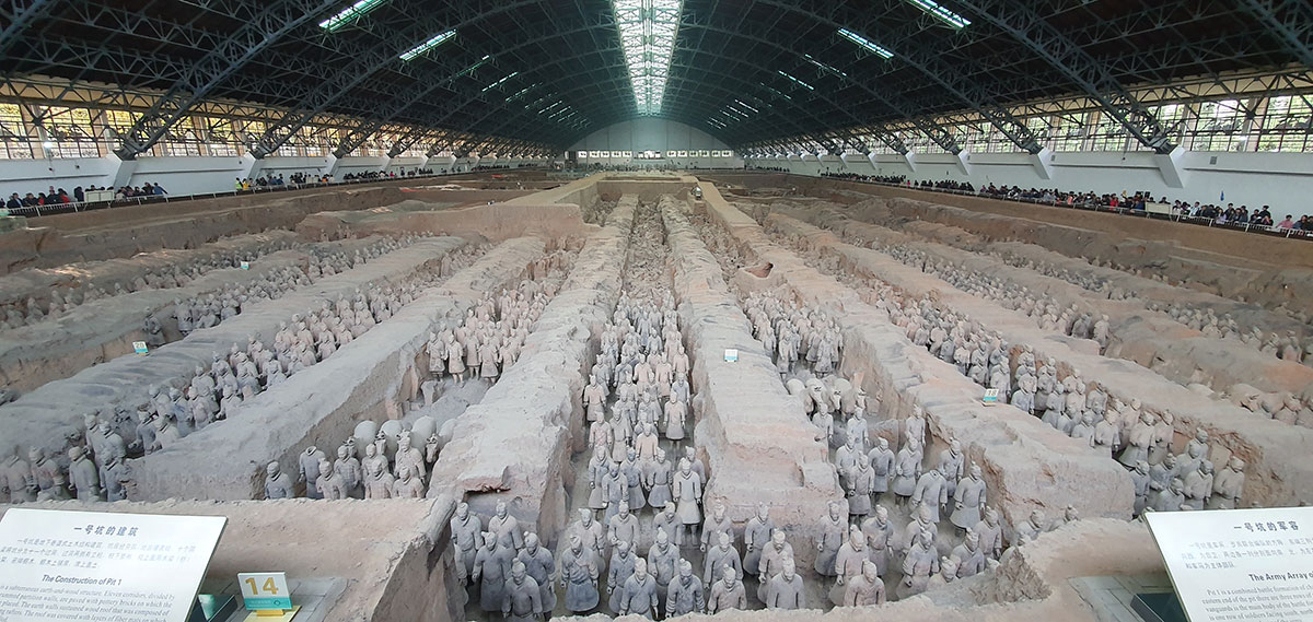 ¿Qué decir de la llegada al primero de los numerosos y gigantescos hangares cerca de la ciudad de Xian (provincia de Shaanxi)? En aquellas fosas excavadas se encuentra el famoso e imponente ejército de terracota del mausoleo de Qin Shi Huangdi (259 antes de J.-C. –210 antes de. J.-C), primer emperador de China, con miles de guerreros de pie o arrodillados y sus caballos. Todos fueron hechos con varios moldes, pero sus rostros con rasgos individualizados tienen una expresión viva y única. Algunas estatuas están en perfecto estado, otras en pedazos, muchas han sido restauradas y otras están en proceso de restauración. Descubierto de manera fortuita en los años setenta, el sitio arqueológico fue declarado Patrimonio de la humanidad por la UNESCO en 1987. El ejército reproducido en terracota tenía que acompañar al difunto emperador en el más allá para toda la eternida. Réplicas y originales de los mundialmente famosos guerreros de terracota han viajado a través del mundo para ser expuestos en Berna (Suiza), Madrid y otras ciudades. El museo de Xian también conserva tesoros de orfebrería y otras hermosas esculturas de terracota.
