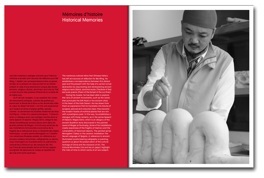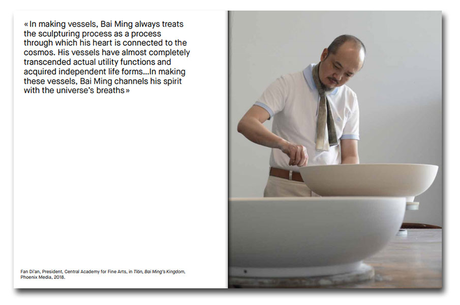 Sin desmerecer los rigurosos y documentados textos de los escritores que participan en este libro, una de las secciones más interesante es la larga entrevista realizada por Mael Bellec, Conservador jefe en el Museo Cernuschi-Museo de Arte Asiático de París. De las propias experiencias, recuerdos y reflexiones de Bai Ming no solo podemos conocer más sobre sus inquietudes y la forma en que se plantea la práctica del arte, sino también la evolución del arte en la China de las últimas décadas, desde que, en los años ochenta comenzó su aprendizaje y trabajo, tanto en pintura como en cerámica.