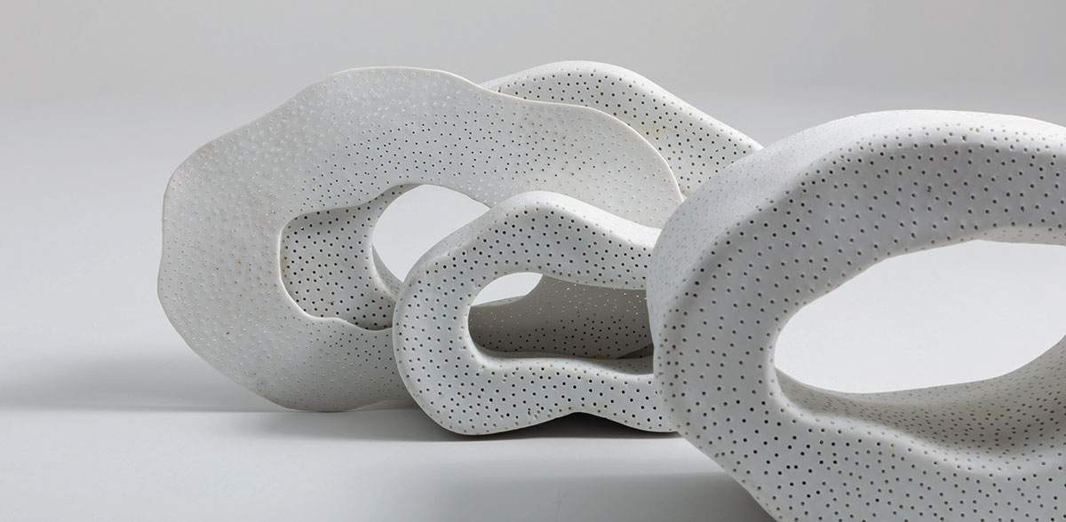 Joan Serra. “R4.1 (G)”. Pasta refractaria blanca, porcelana y – 1 – pâte réfractaire blanche, porcelaine, bolas de arcilla expansiva. 72 cm. (aproximadamente). (©Galerie Capazza.)