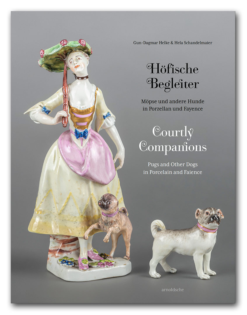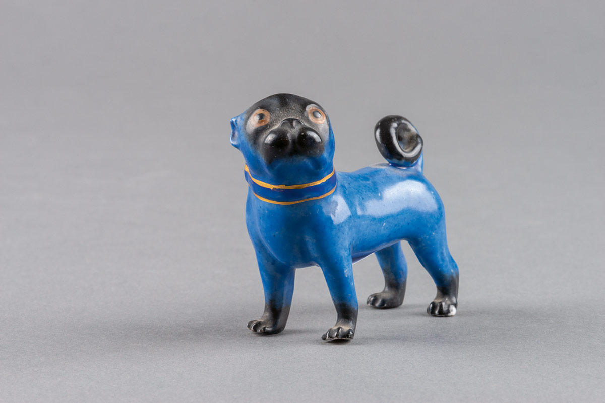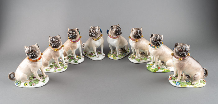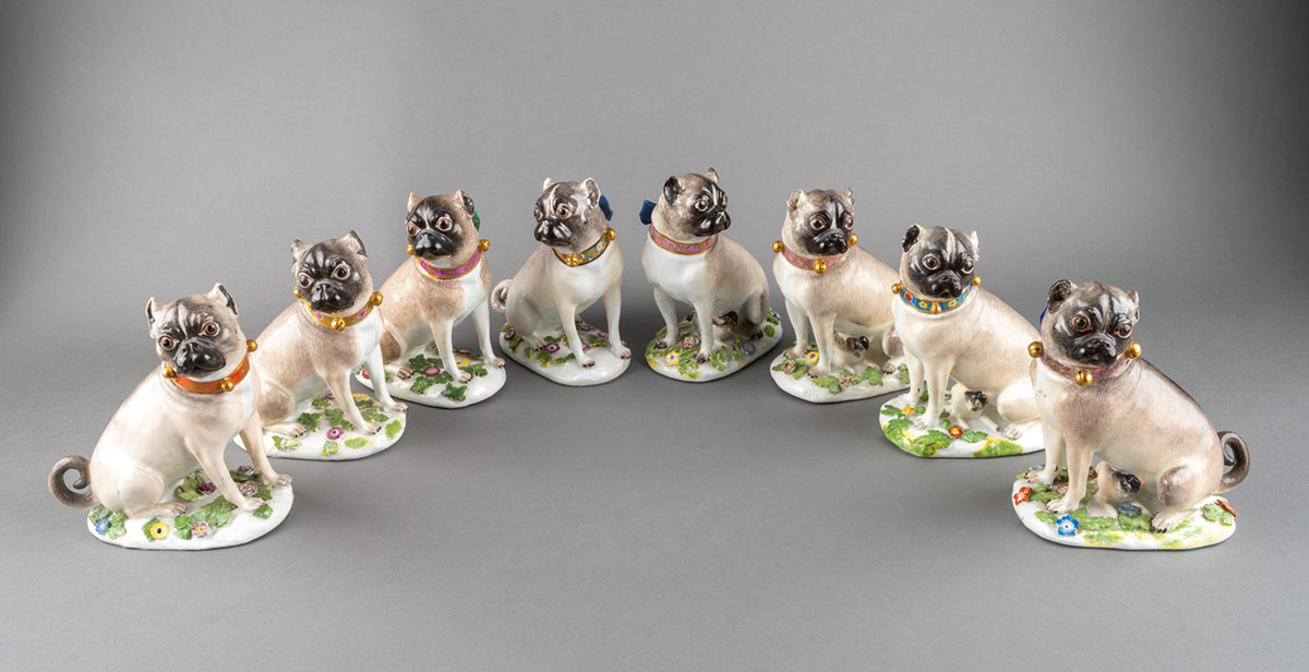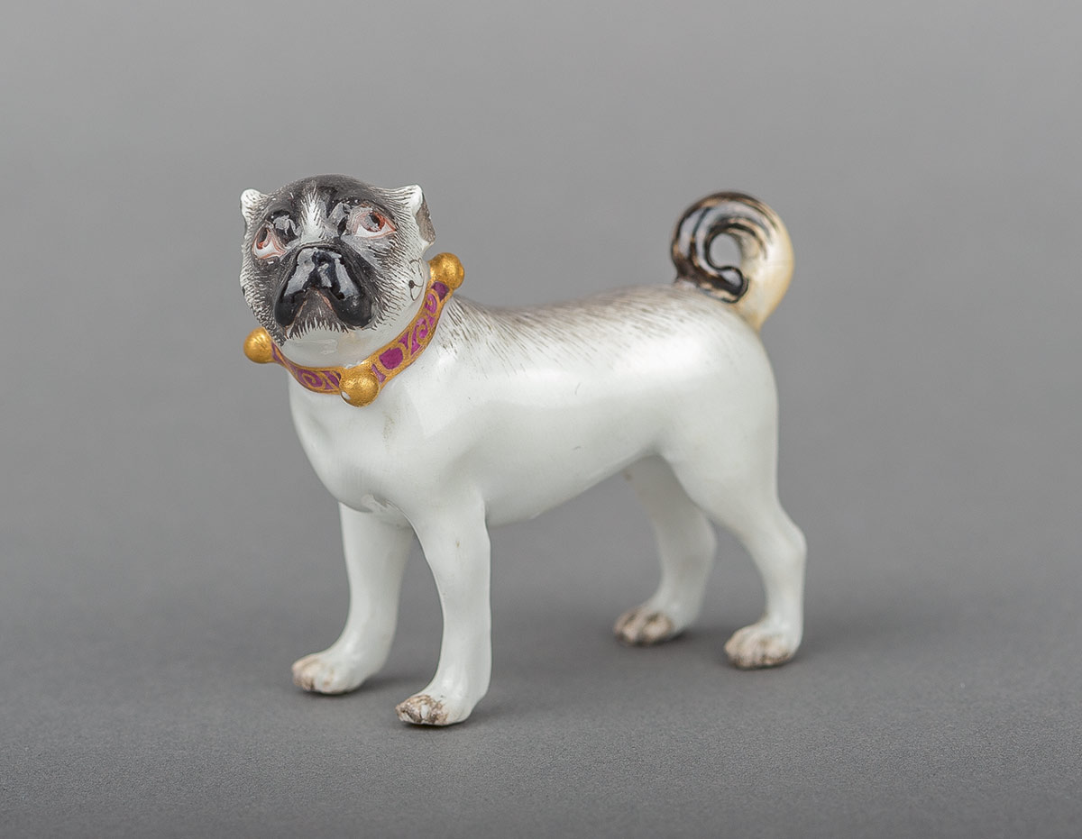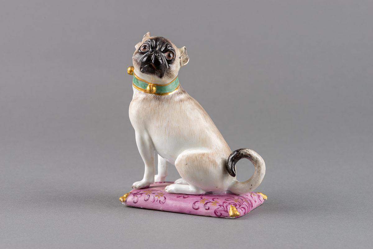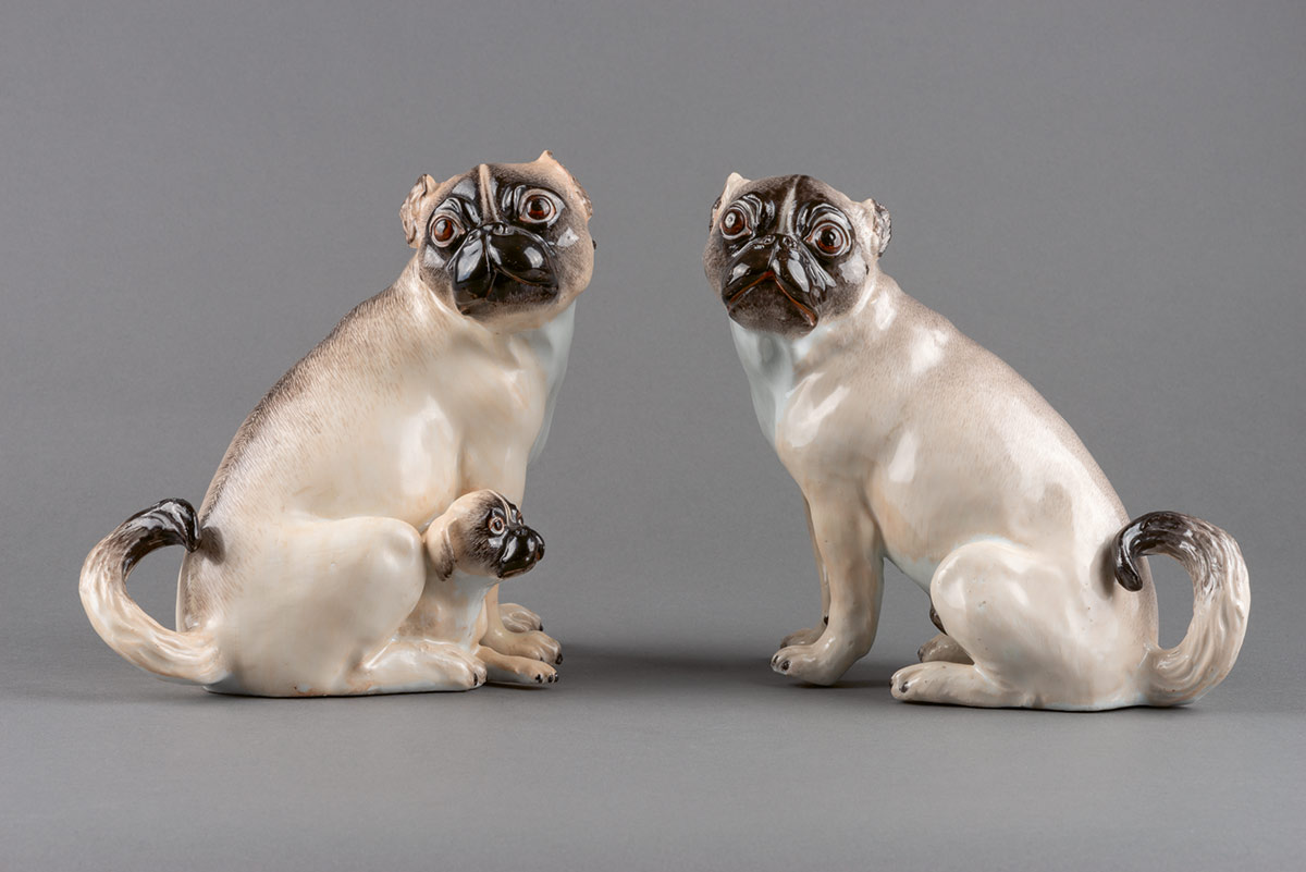 Como era de esperar, la porcelana y la loza del siglo XVIII reflejó la pasión que las cortes europeas sintieron por estas pequeñas y jadeantes mascotas. El modelista más importante de la Manufactura de Meissen, Joachim Kaendler, creó decenas de modelos de estos animales, en todas las posturas, colores y actitudes posibles, pero siempre reflejando la gracia que les caracteriza. Incluso llegó a realizar retratos de animales reales, como el del Conde Heinrich von Brühl, que quedó de esta forma inmortalizado en porcelana.