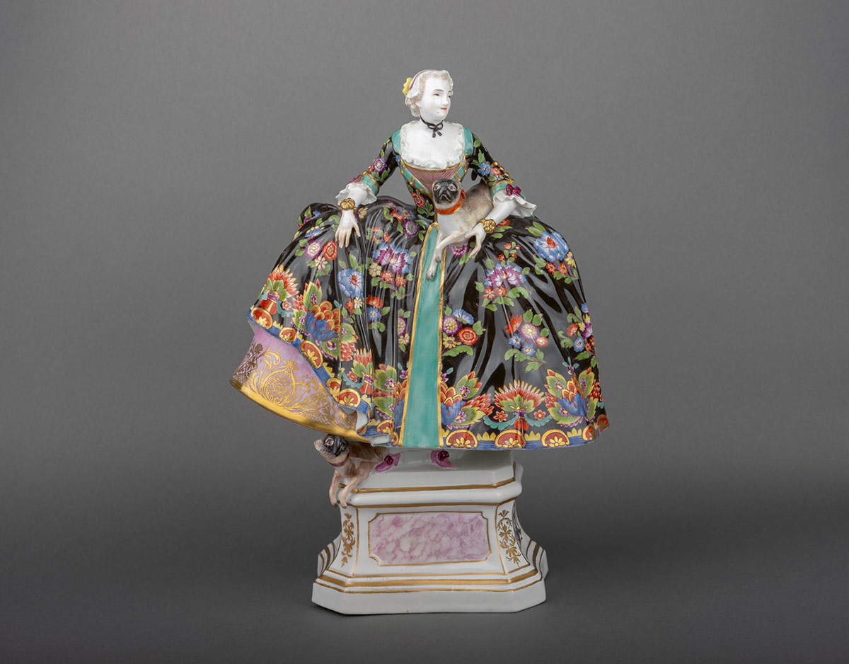 “Dama de la ‘orden Pug’ con dos pugs”. Meissen, 1743. Modelado por Johann Joachim Kändler. 30,5 x 20 x 14 cm. (Foto: © Bernd Bauer.)