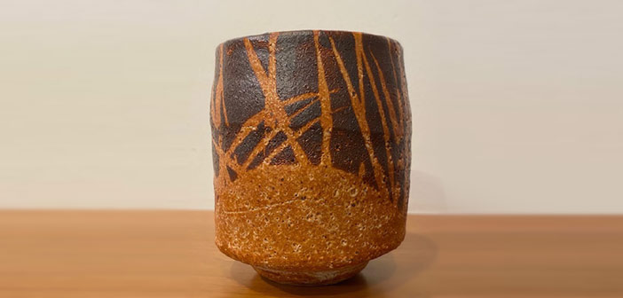 Foto: “Yunomi”, esmalte shino craquelado sobre engobe de hierro y decoración con pincel, 2021. Fres, 10,9 × 10,1 × 10,1 cm.