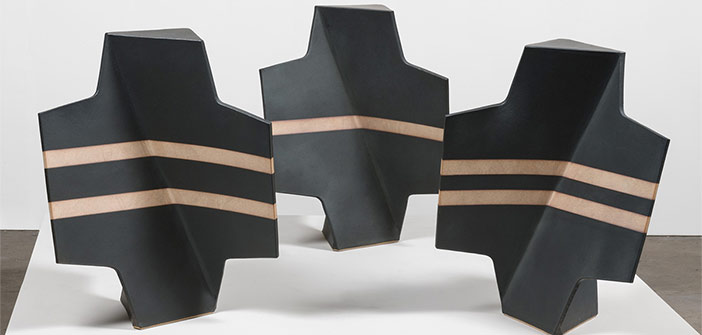 Foto: “Crosses. Three of a Kind”, 2004. Cerámica esmaltada, 83,8 × 26 × 26 cm. (Foto: Jeff McLane). Foto de promoción de la exposición “JOHN MASON. Geometric Force”, que se pudo ver el pasado año en la Galería Gagosian, de Nueva York.)