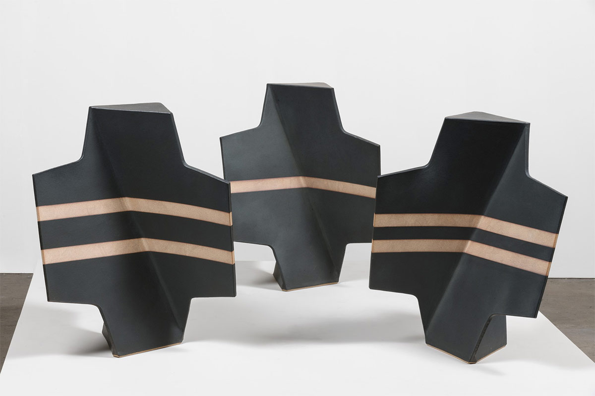 Foto: “Crosses. Three of a Kind”, 2004. Cerámica esmaltada, 83,8 × 26 × 26 cm. (Foto: Jeff McLane). Foto de promoción de la exposición “JOHN MASON. Geometric Force”, que se pudo ver el pasado año en la Galería Gagosian, de Nueva York.)