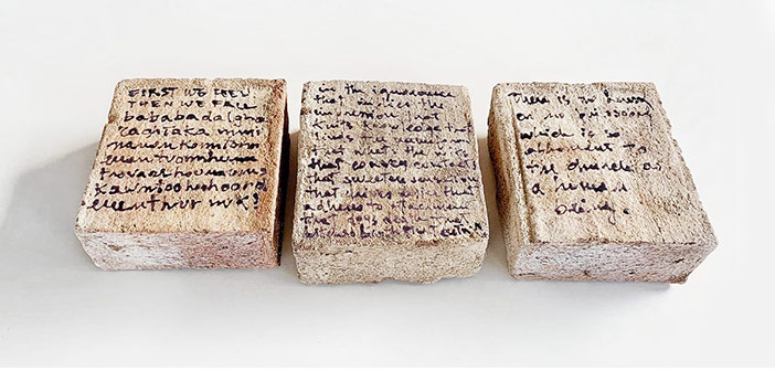 “The library of encoded time” (Detalle), 2019. Esmalte sobre ladrillos antiguos. 5 x 14 x 12 cm cada uno. (Foto: Claudia Ciacciofera.)