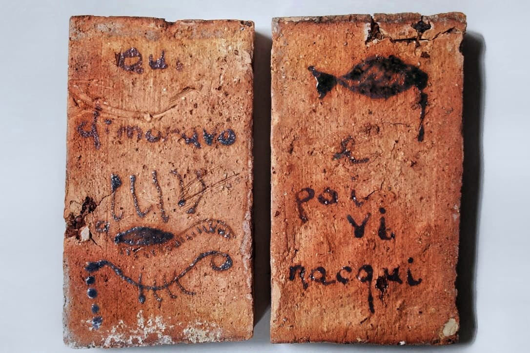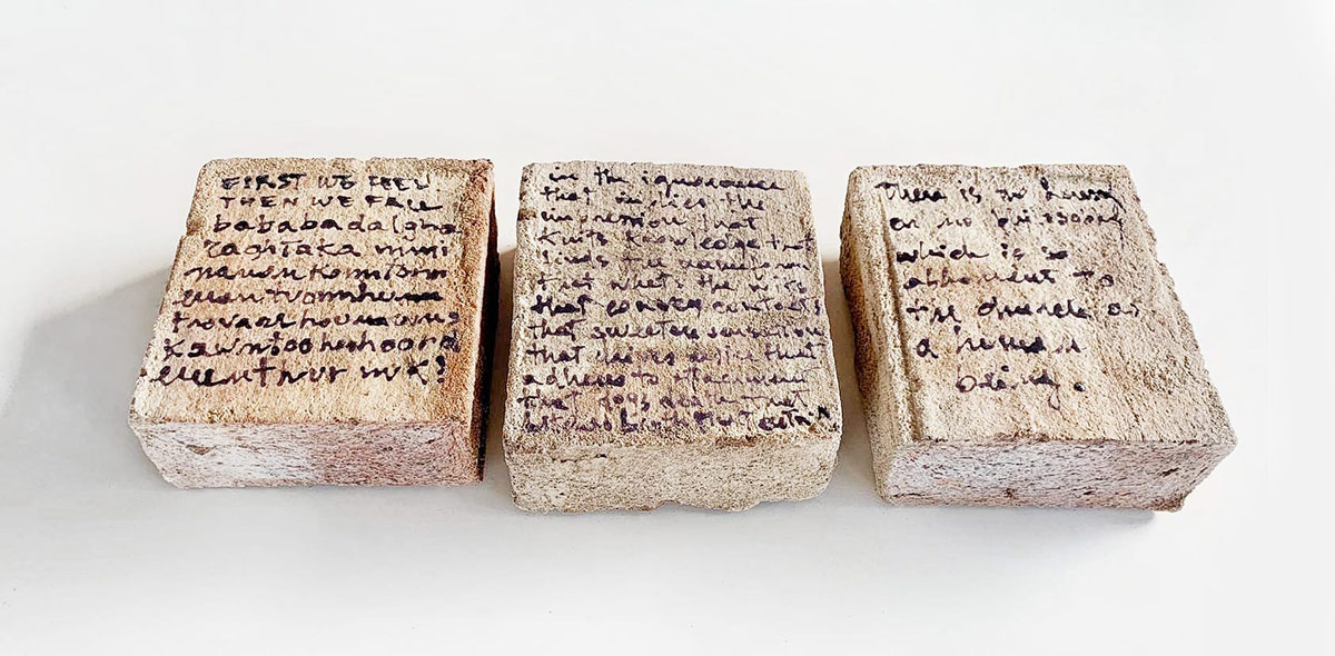 “The library of encoded time” (detale), 2019. Esmalte sobre ladrillos antiguos. 2 × 16 × 9 cm cada uno. (Foto: Laudisia Colonnelli.)