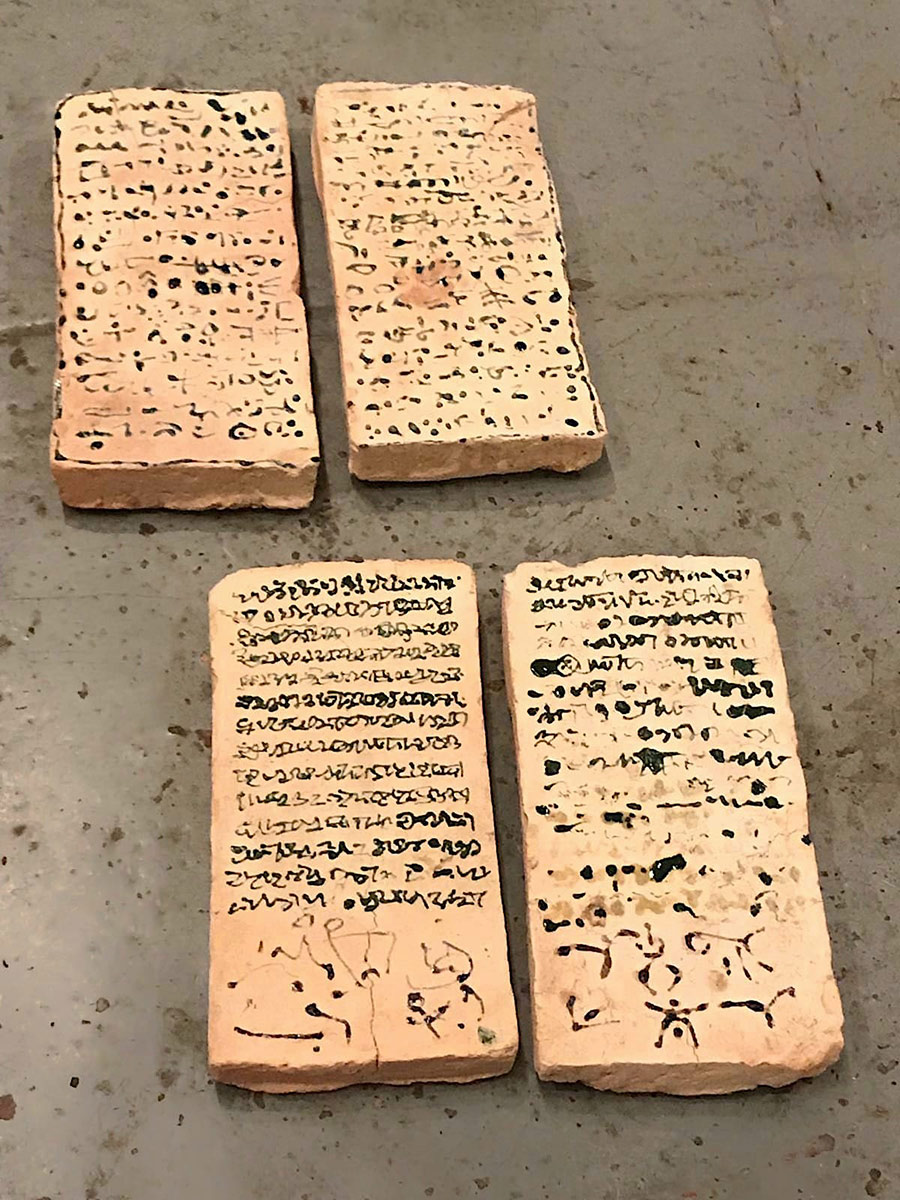 “The library of encoded time” (Detalle), 2019. Esmalte sobre ladrillos antiguos. 5 x 14 x 12 cm cada uno. (Foto: Claudia Ciacciofera.)