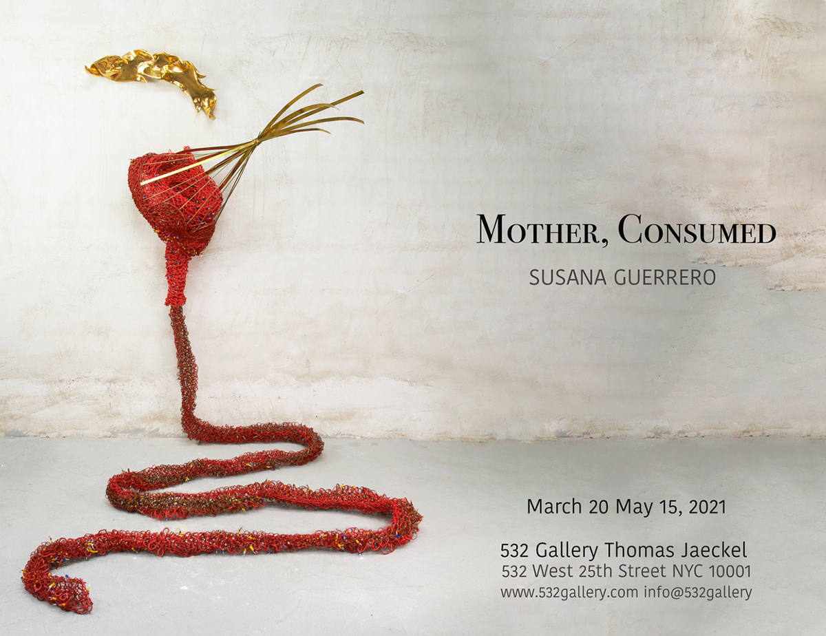 En Mother, Consumed, la segunda exposición individual en la galería de arte 532 Thomas Jaeckel de Nueva York, Susana Guerrero presenta una serie de esculturas que exploran la catarsis entre madre e hijo durante la gestación, ese período en el que dos vidas están entrelazadas y la mujer comparte sus propios órganos, sustento y espíritu para que un nuevo ser completamente autónomo pueda brotar al mundo. Parcialmente inspiradas en el mito hispano-mediterráneo “La Mare dels Peixos”, en el que una mujer entrega su propia carne para engendrar otras vidas, para renacer después de nuevo.