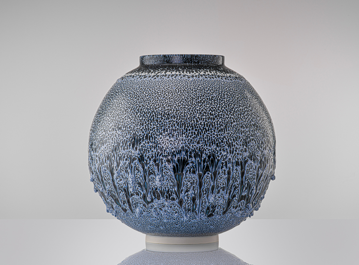 Las grandes vasijas de Montserrat, con sus líneas amplias y puras, ofrecen la superficie perfecta para que sus exmaltes se desarrollen hasta su máxima expresión; pero es este un recorrido en dos sentidos, ya que, al contemplar la belleza de sus esmaltes superpuestos o sus “gotas de aceite”, percibimos claramente como estas superficies no hacen otra cosa que realzar la forma, darle una presencia imponente, un diálogo permanente entre forma y color, entre textura y línea, entre superficie y espacio interior.