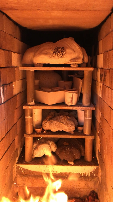 Sin embargo, en las tres cocciones que hemos hecho los resultados han sido cada vez mejores, no hay problema en alcanzar los 1.300 °C y la temperatura está igualada en los tres metros de longitud del horno, también se puede observar que, debido a la forma, tan estrecha y larga, la ceniza viaja sin problemas desde la cámara de combustión hasta todos los rincones del horno. También otros detalles más técnicos y sin duda importantes: es fácil controlar la atmósfera, modulando la reducción como necesitemos, no es demasiado humeante y, si es necesario, se puede mantener la temperatura durante horas, con un mínimo gasto de combustible.