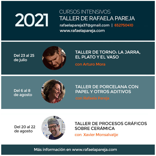 Rafaela Pareja organiza en los próximos meses en su taller de Vinalesa (Valencia), tres cursos dedicados al torno, con Arturo Mora; procesos gráficos sobre cerámica, con Xavier Monsalvatje, y porcelana con papel y aditivos, con la propia Rafaela Pareja