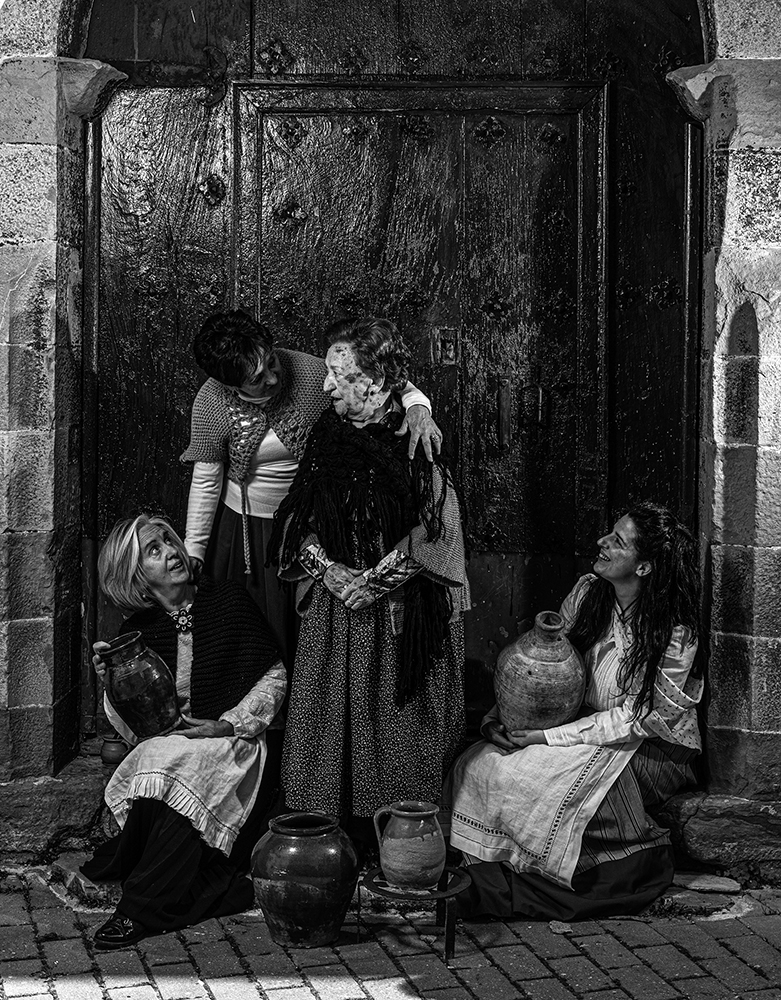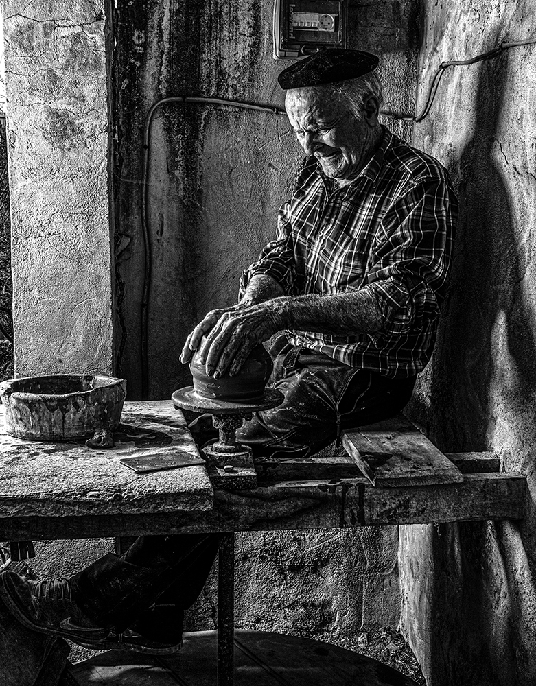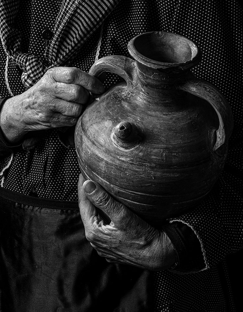 Y son estos dos aspectos, imágenes y texto, los que marcan la diferencia respecto a otros libros, quizá más académicos, que se publican sobre alfarería u otros temas etnográficos. En cuanto a la fotografía, de Joseba Urretavizcaya, cabe resaltar que, aunque en un principio pueden parecer recreaciones históricas, en seguida vemos que son algo más; en la cuidada preparación de las escenas el fotógrafo no busca de forma estricta la simulación. No se trata tanto de que “parezcan” fotos antiguas sino de recrear el ambiente. Los personajes fotografiados son descendientes de los alfareros, que posan en actitudes que recuerdan las que vivirían en el quehacer diario sus abuelos y abuelas, pero sin necesidad de disfrazarse propiamente, simplemente con ropas en consonancia, sencillas como las que vestían los alfaferos y alfareras, con prendas quizá rescatadas de un viejo arcón, aunque sin necesidad de quitarse las modernas gafas o zapatos. Sin duda una forma elegante de recordar el pasado y la herencia desde el respeto, y también una sensación de que no trata el fotografo de recrear una “foto fija” de ese pasado, sino integrarlo en la vida actual, como una forma de reivindicar la memoria desde el presente.