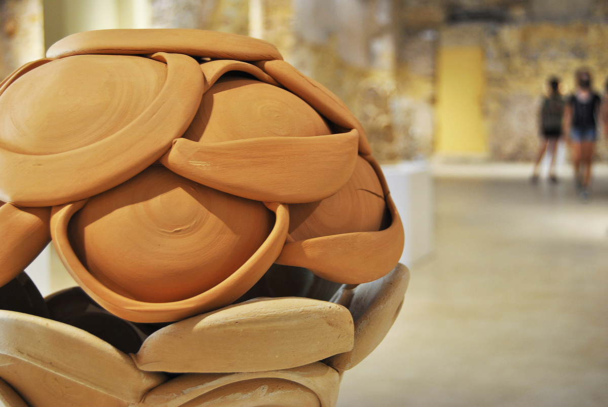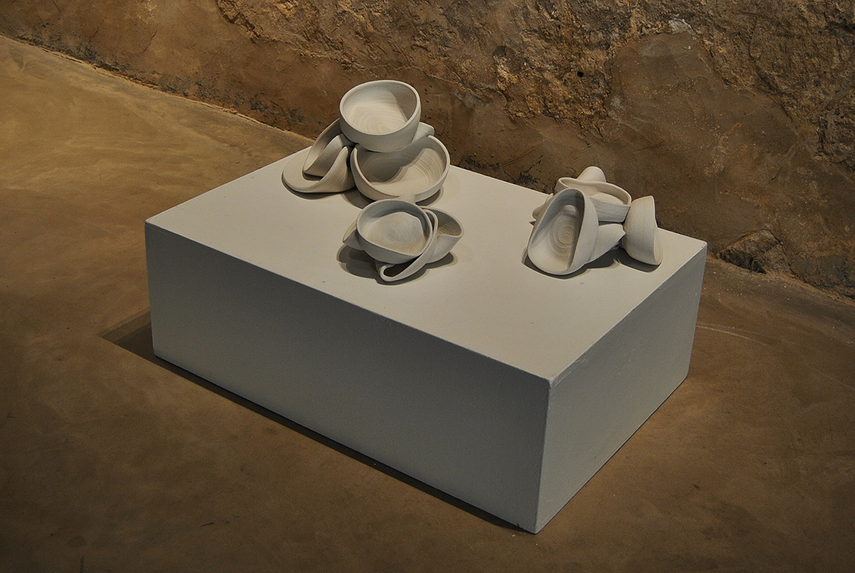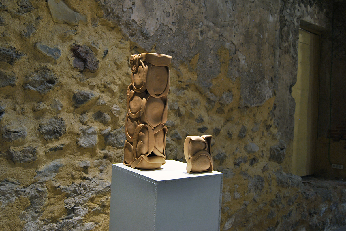 Las piezas han sido torneadas de manera manual e individualmente hasta conseguir un acabado técnico perfecto para su utilidad, es en este momento en el que el artista rompe esta finalidad para generar formas de gran formato acumulándolas y creando unas piezas que serán sometidas a altas temperaturas de cocción. Estas piezas carecen de esmaltados ya que impediría ver su esencia verdadera definida por la belleza y la armonía de su propia imperfección. Esta filosofía japonesa denominada “wabi sabi” junto a la búsqueda creativa inspirado por la naturaleza, definen la creación del artista y queda plasmado en sus obras, las cuales ha trasladado a este espacio expositivo singular donde conviven, mostrándose