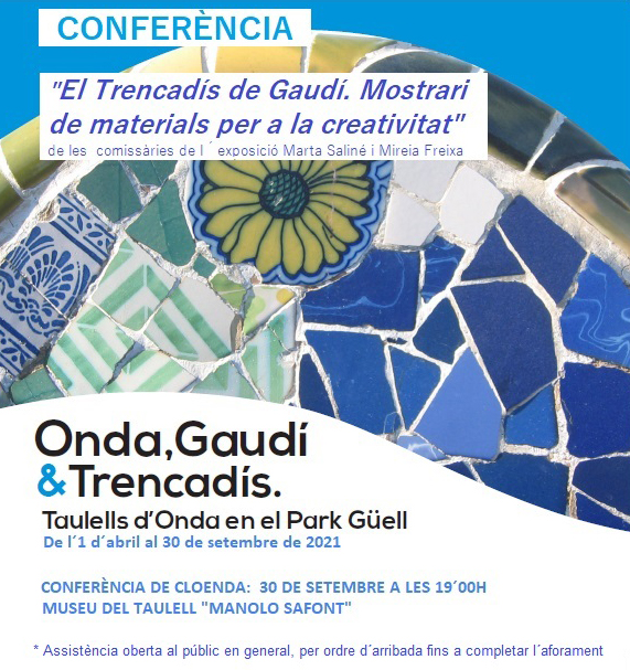 El jueves 30 de Septiembre, a las 19 h., tendrá lugar en el Museo del Azulejo en Onda (Castellón), la conferencia de clausura de la exposición “Gaudí & Trencadís”