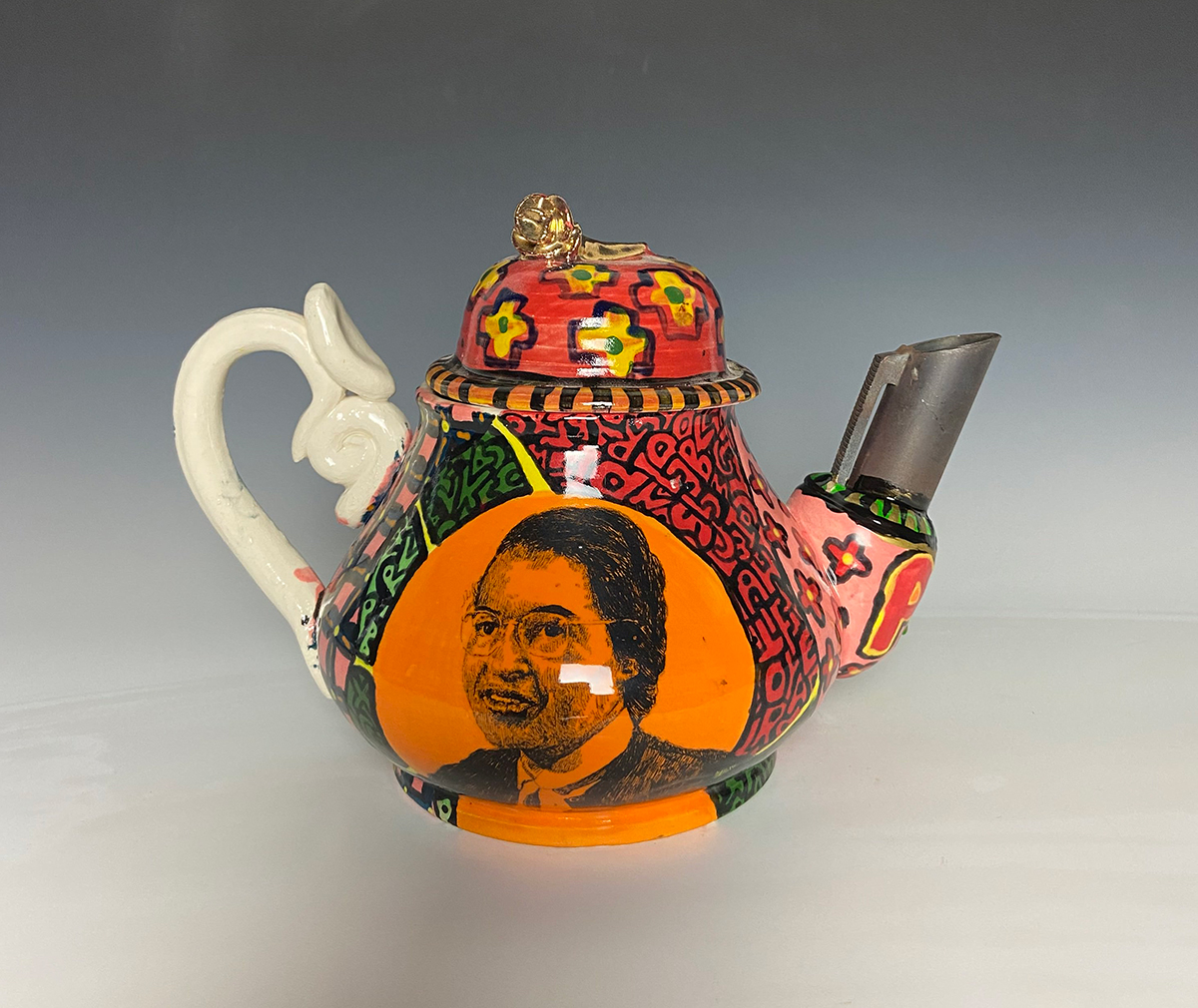 Foto: Roberto Lugo, “Gun Teapot: Rosa Parks”, 2021. Cerámica esmaltada, lustre, acero, epoxy y colores sobrecubierta. (Foto: Dominic Episcopo courtesy of Wexler Gallery.)