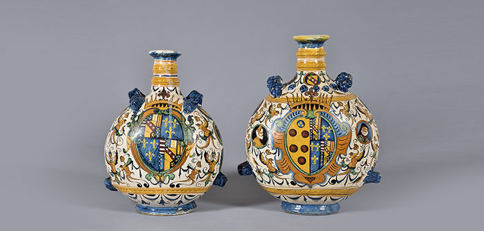 Par de frascos “Grutesco sobre un fondo blanco” con el escudo de armas de Medici-Lorraine. Montelupo, ca 1591-1592. Mayólica
