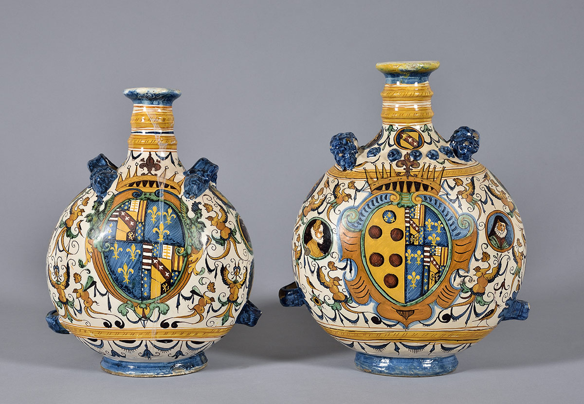 Par de frascos “Grutesco sobre un fondo blanco” con el escudo de armas de Medici-Lorraine. Montelupo, ca 1591-1592. Mayólica