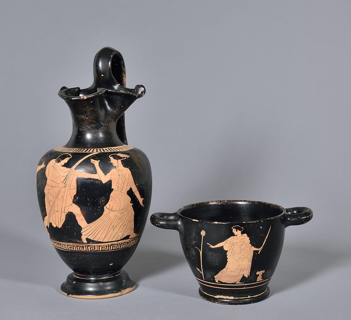 Oinochoe y skyphos de “figura roja”, respectivamente con “Teseo persiguiendo a una mujer” y con sátiro y ménade en lados opuestos, prov. de la necrópolis de Spina. Producción de attica, 460-450 a. C. ca.