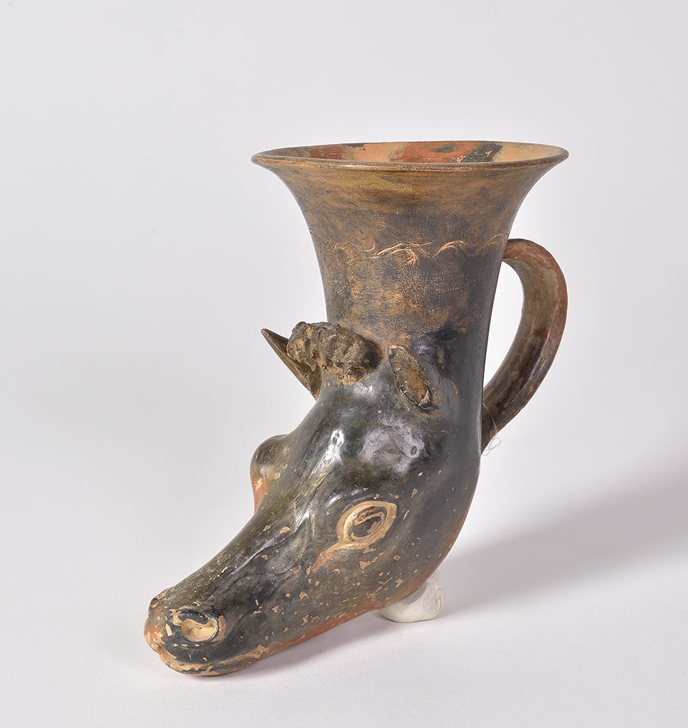 Rhyton “en pintura negra” configurado como cabeza de ciervo, con decoración vegetal grabada en el cuello. Probable producción tarantina, 350-325 a. C. ca.