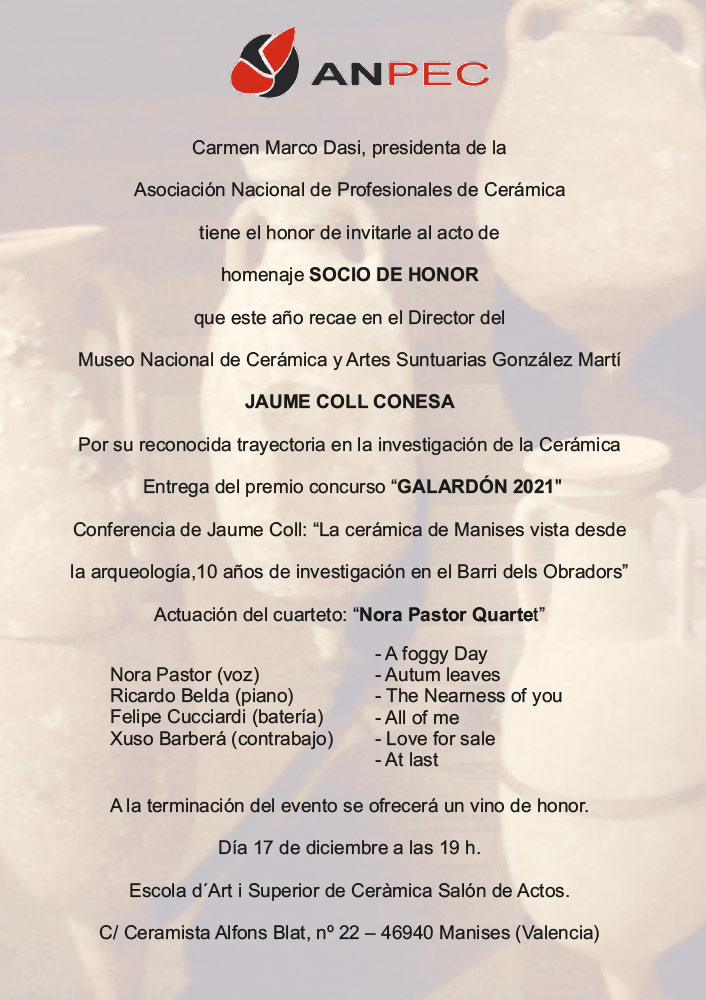 Jaume Coll Conesa, Director Museo Nacional de Cerámica y Artes Suntuarias “González Martí”, es el nuevo “Socio de honor” de la Asociación Nacional de Profesionales de Cerámica (ANPEC)