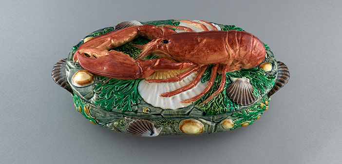 Matilda Charsley (1823-1904), diseñadora; Minton & Co., fabricante. “Plato de la langosta”, forma no. 1543, diseñado en 1868; este ejemplo se fabricó en 1869. Mayólica, 14 × 24 × 21 cm. Fotografía: Bruce White.