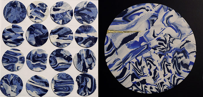 El título de esta pieza es “Trocitos de cielo y mar”. Esta obra se compone de un díptico realizado con porcelana y con las técnicas de Neriage, Nerikomi y Kintsugi.