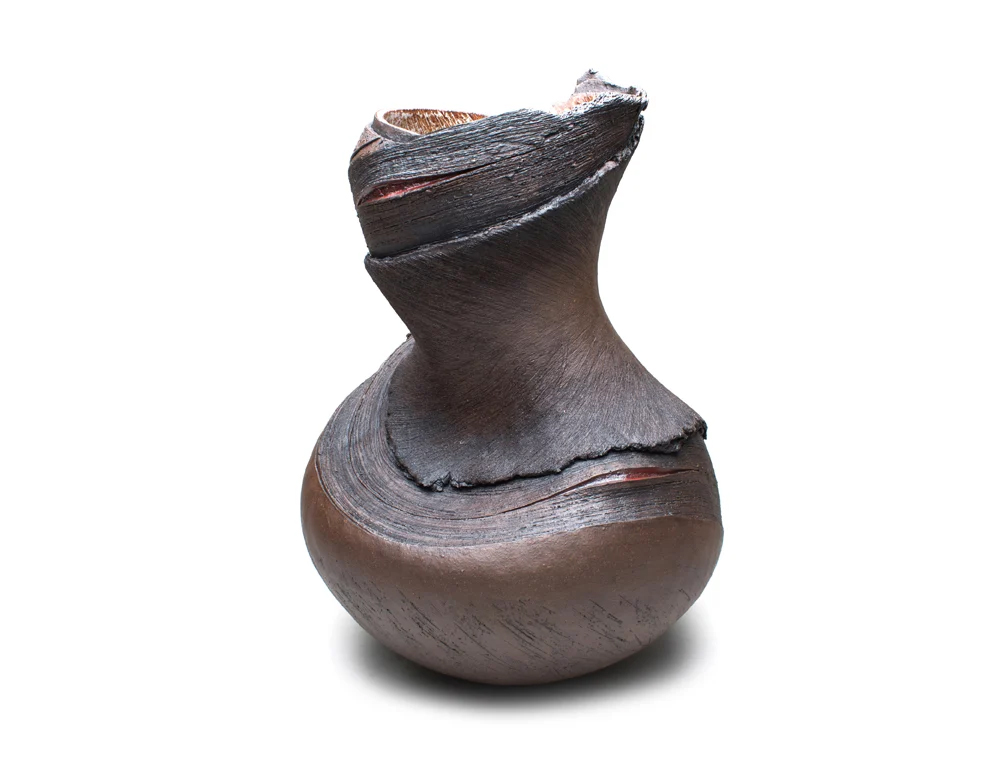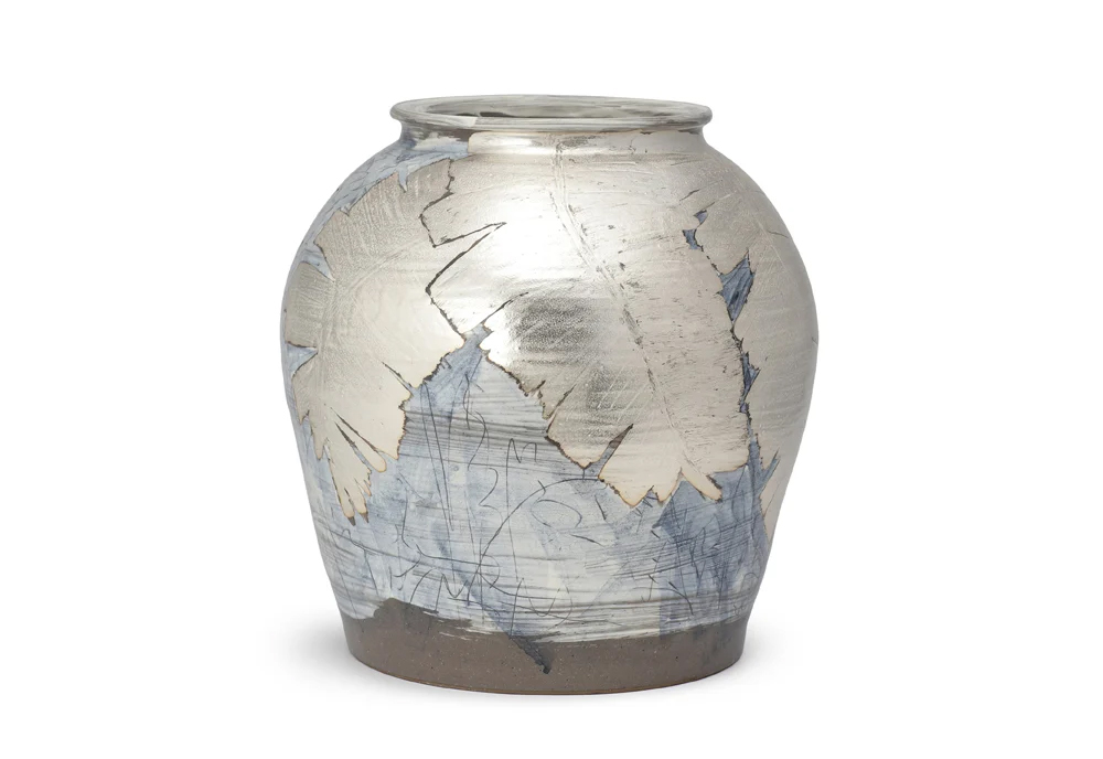 Sangwook Huh. República de Corea. “Vessel with Plantain Surface Decoration”. Arcilla, engobe blanco y lustre plateado