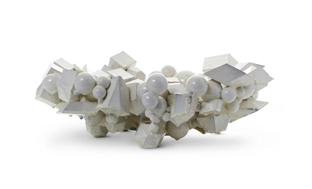 Este potente y dinámico trabajo de gres combina formas geométricas para crear una pieza individual, escultóricamente fuerte por sí y en sí misma. Cada forma individual ha sido cuidadosamente equilibrada y cocida como un todo, y su espectacular tamaño se contrarresta con un delicado esmalte cristalino. La obra demuestra una apasionada y técnica comprensión de la alquimia exacta necesaria para producir estos cristales y un conocimiento inherente de cómo se comporta la arcilla en todas las etapas del proceso de creación.