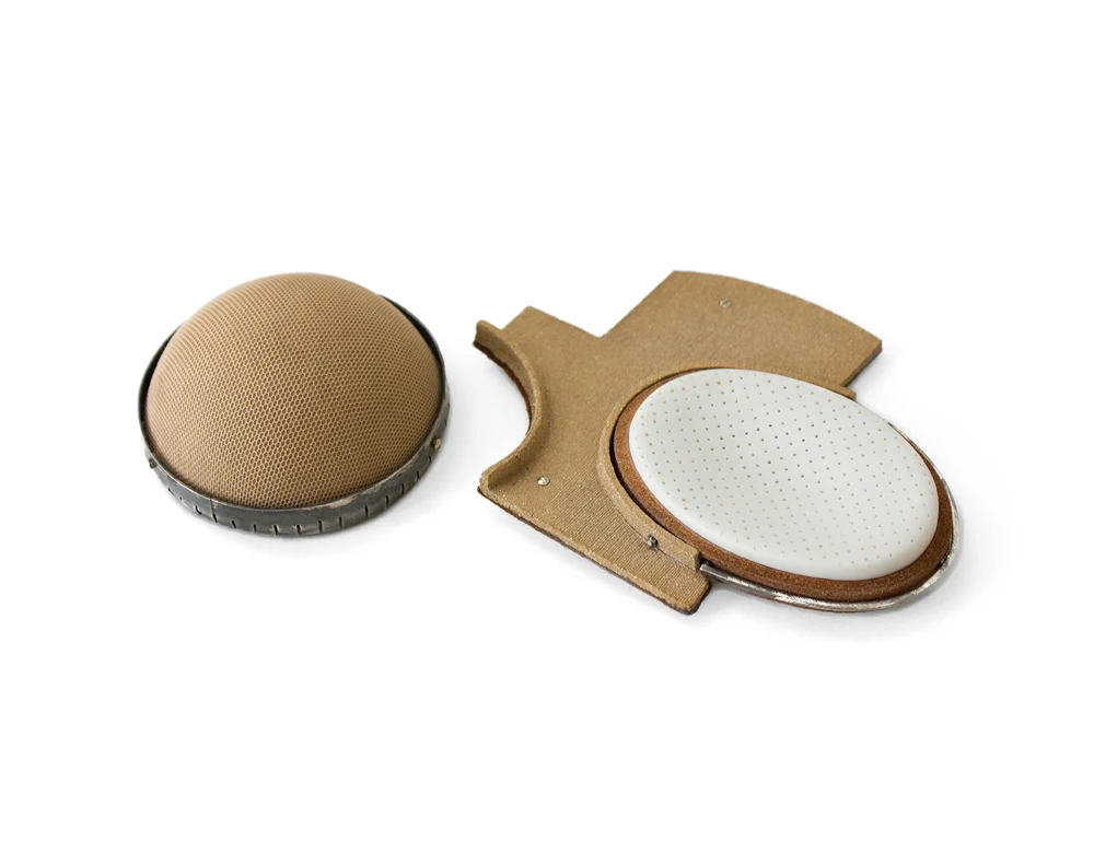 Confundiendo las expectativas del espectador, la paleta y los materiales elegidos para este broche están destinados a crear una sensación de tacto que engaña al ojo del espectador. Contreras ha creado algo que a primera vista parece una segunda piel, pero que, con más atención, se revela como una joya ornamental. Creada a partir de dos elementos hechos de porcelana, gres terroso y cuero y envueltos en tul, que se pueden combinarse en una sola pieza, las composiciones se han ensamblado en plata, utilizando técnicas de joyería tradicionales.