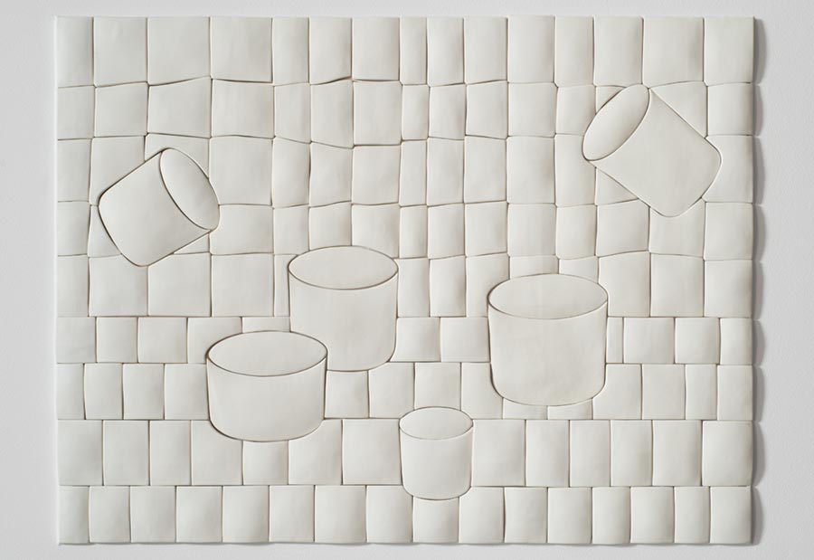 Las obras de arte minimalistas de Kirsi Kivivirta suelen ser monocromáticas y constan de innumerables elementos cerámicos, pequeños y repetidos. Las piezas representan encuentros e interacciones en diversas condiciones y entornos, a menudo basados en la vida cotidiana. Hace estas piezas en forma de puzzle extendiendo la arcilla y cortándola con un cuchillo afilado. Cada pieza se esmalta con una paleta limitada de tonos, se cuece y se ensambla en una obra de arte unificada sobre una lámina de aluminio. Este proceso requiere mucho trabajo y, en cierto modo, se asemeja a la pintura con pincel. En su arte, Kivivirta compone, moviendo las piezas y los elementos para encontrar su lugar adecuado y su dinámica mutua, creando ritmo y líneas. Su objetivo es crear armonía reduciendo, eliminando variables y sacando así a la luz el núcleo de lo que representa su obra.